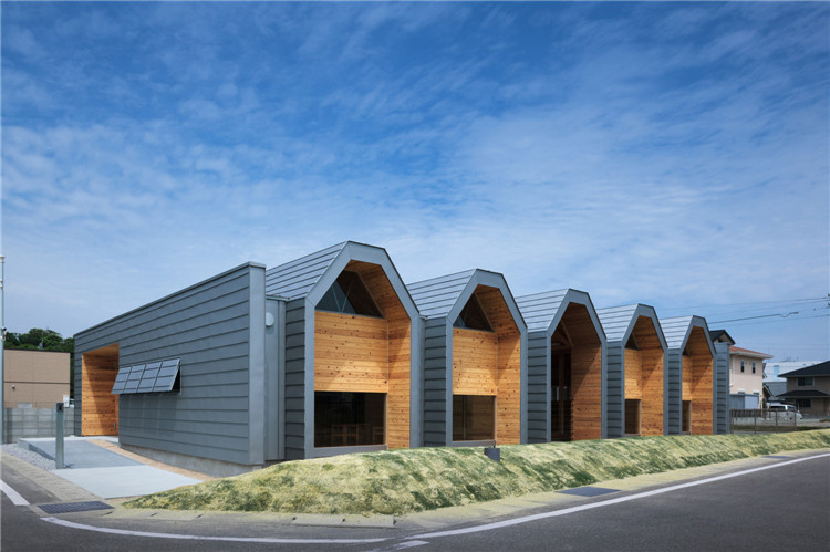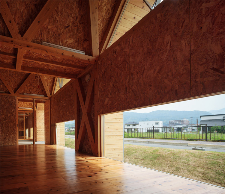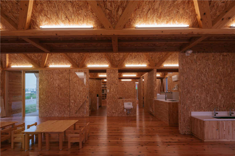本案托兒所位于福岡市附近的太宰府市,為了容納更多的孩子,不得不增加為兩個(gè)班級(jí)??紤]到日本全國范圍的出生率下降,不久的將來這里的孩子數(shù)量可能會(huì)減少,因此建筑師決定建造一座只有一室空間(9米跨度)的建筑,內(nèi)部沒有支柱,方便各種用途(游戲室等)的轉(zhuǎn)換。木桁架梁在工廠安裝,用拖車運(yùn)送到施工現(xiàn)場。復(fù)雜的連接也是在工廠制作的,只有一個(gè)相對(duì)容易的連接在現(xiàn)場組裝。這樣的方式提高了施工精度,縮短了施工工期。