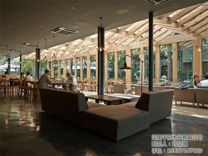 且新增的木梁在原有的鋼梁結(jié)構(gòu)之間交織穿梭,形成豐富有層次的光影效果,尤其是在天氣晴好的時候,體驗感更為直接。對于空間區(qū)域的分割,設(shè)計團隊也著手從天花板部分來創(chuàng)造。比如前述提到的主要的編織木梁結(jié)構(gòu),其下方的空間寬敞明亮,更適合于那些喜愛沐浴在陽光或自然天光之下的客人們。而靠近建筑內(nèi)部的空間,在灰黑色的天花板映襯之下,則要顯得沉穩(wěn)、私密一些,顯然更適合那些需要安靜空間的客人們。