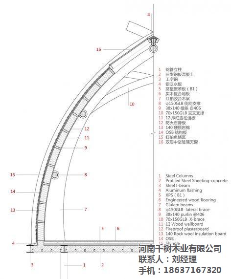 拱形的船身結(jié)構(gòu),由四組三鉸拱木拱梁通過(guò)五根圓木連接為整體,每組三鉸拱由左右兩個(gè)對(duì)稱半拱吊裝拼接,而每個(gè)半拱又由兩道十一公分寬的北美花旗松膠合拱梁組合成,拱頂?shù)男〗徊嬲鎸?shí)反應(yīng)拱結(jié)構(gòu)的對(duì)接特征。采用三鉸拱的形式,避免了木材因過(guò)度彎曲而產(chǎn)生超限的應(yīng)力。整個(gè)屋面系統(tǒng)保持在拱梁的厚度之中,內(nèi)部紅雪松掛板使用水性清漆保持原木紋理和觸感,外部使用了三種尺寸的紅雪松木瓦上下微錯(cuò)的鋪裝方式,質(zhì)感自然。