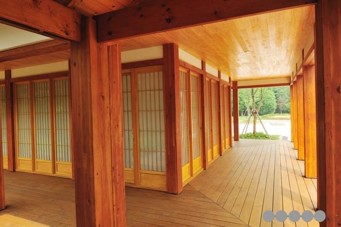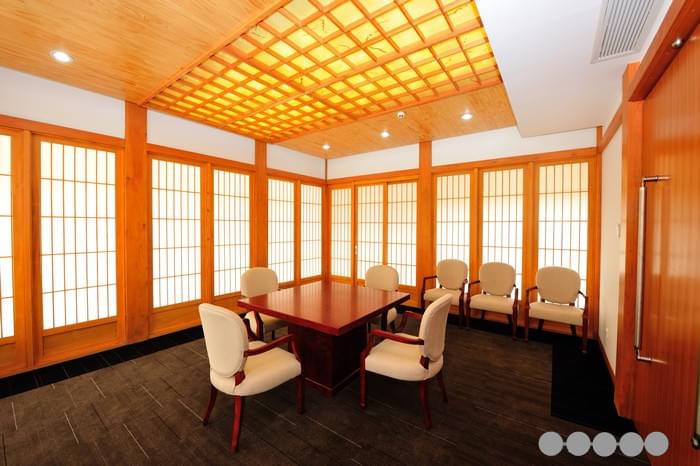 百花園日式木建筑四周有日式的圍廊和陽(yáng)臺(tái),但采用的是花旗松膠合主柱和鐵杉防腐木地板。一樓和二樓均采用了大面積的和式移動(dòng)門(mén)窗,裝飾以日本進(jìn)口的幛子紙,透光而不透視,而所有日式門(mén)窗均采用溫潤(rùn)細(xì)膩、耐腐抗變形的加拿大黃柏。循花旗松實(shí)木樓梯拾級(jí)而上,是日式茶室、辦公會(huì)客室、休息室和秘書(shū)室等功能區(qū)劃。整個(gè)室內(nèi)裝飾以針葉材實(shí)木板條和流白為主,地面是十分日本式的青石板,頂部的日式燈具均用直紋的花旗松實(shí)木在工廠定制而成。