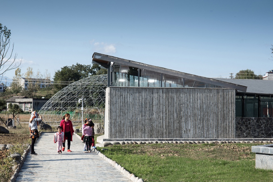 建筑需要面對新的長龍大道,也需要對新老路的轉(zhuǎn)角空間進行回應(yīng)。墻體遇到親子活動的部分,折疊成弧形空間,包裹出其所需的室內(nèi)外場所;而在接待的部分,墻體則流動成線性空間,如巷道般通向村口,作為視覺和功能的導(dǎo)引,其正面又剛好圍合出面對長龍大道的入口場地,同時,巷道的另一個出入口也自然融入到親子活動的路徑上。