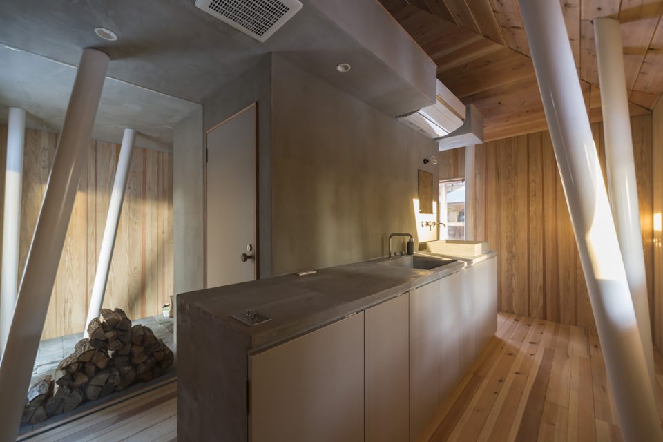 房屋的建造使用了120棵年齡為80-90歲、直徑約40厘米的大樹,沒有經(jīng)過任何特殊處理,也沒有刻意將木材切割至標準尺寸,這使得木材完全地保持了其原本的狀態(tài)。與遵照認為規(guī)定的現(xiàn)代社會不同,“一年住宅”完全順應了自然。通常情況下,人們不會完整地用光一整棵樹,但本項目卻以靈活的建造方式實現(xiàn)了這一點。