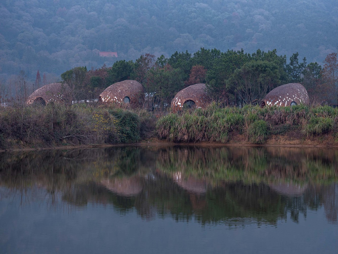 種子木屋整體呈橢球形,底部采用鏡面鋁板,往高處漸變?yōu)槟就?。鏡面鋁板隨著季節(jié)、天氣的變化,反射周圍的環(huán)境和氛圍,冬季時(shí)是紅土地,春夏季時(shí)是綠植,潮濕時(shí)是氤氳霧氣,晴天時(shí)是明媚陽光。鏡面鋁板是種子屋落地生根的部分,上部的木瓦則使建筑逐漸回歸自然柔和的本質(zhì)。