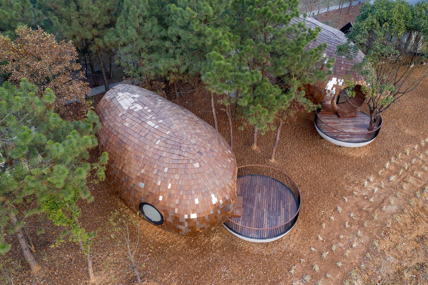 初始設(shè)計(jì)時(shí),業(yè)主希望建筑采用擬態(tài)形式,與大自然的元素產(chǎn)生聯(lián)系。我們將住宿的感受、空間的特點(diǎn)、視線的方向等因素綜合思考,最終形成了種子木屋這種或許并不常見的建筑形態(tài)。
