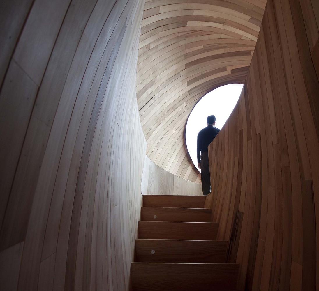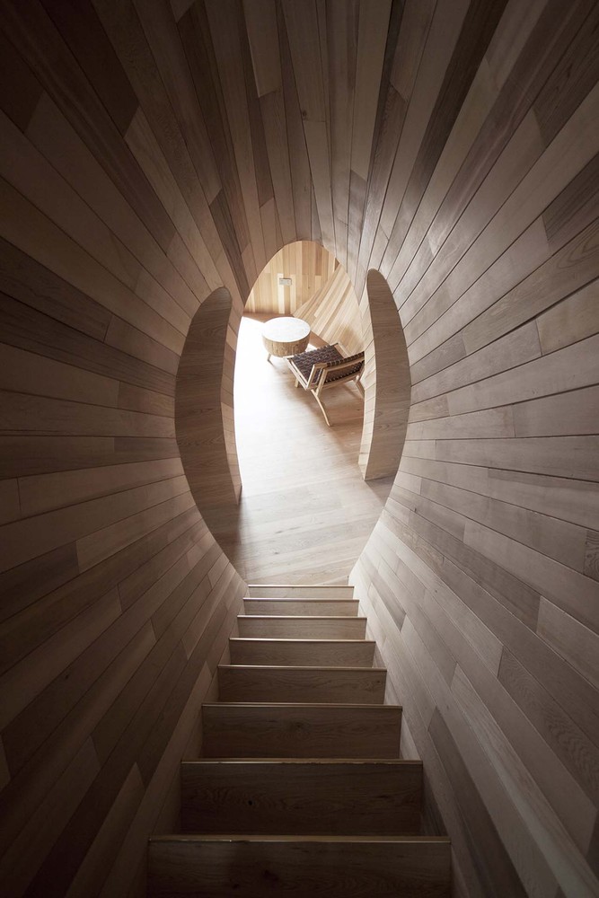 種子屋室內(nèi)墻面采用統(tǒng)一的木拼,自然的木色變化形成的條紋感,進(jìn)一步強(qiáng)調(diào)橢球形態(tài)的空間感。主臥后側(cè)體量容納入口、衛(wèi)浴、儲(chǔ)藏等功能區(qū),同時(shí)形成親子區(qū)閣樓。閣樓與一層通過一個(gè)插入式的橢圓柱型樓梯間連接,同時(shí)樓梯間與入口空間穿插,形成有趣的異形空間。