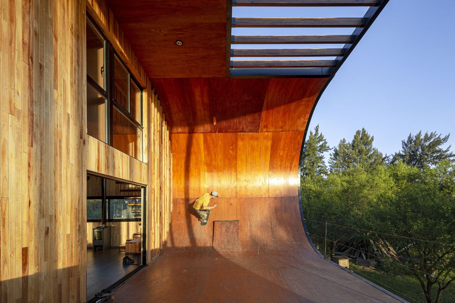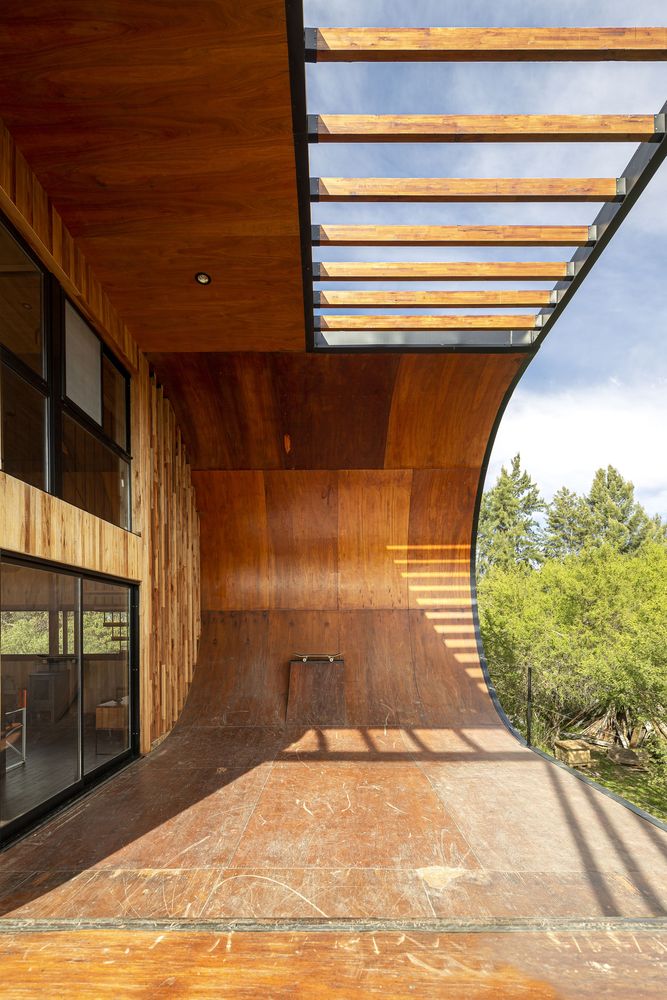 這是一個100%可持續(xù)的住宅,同時業(yè)主也可以在上面滑滑板。業(yè)主是一名滑板者,希望房子本身附帶一個滑板場地。設計師將室外陽臺設計成滑道,并在向南一側設置一面墻,在住宅東南角形成一個向上的弧形用于減速。這面墻延伸到了屋檐處,起到阻擋夏天烈日的作用。