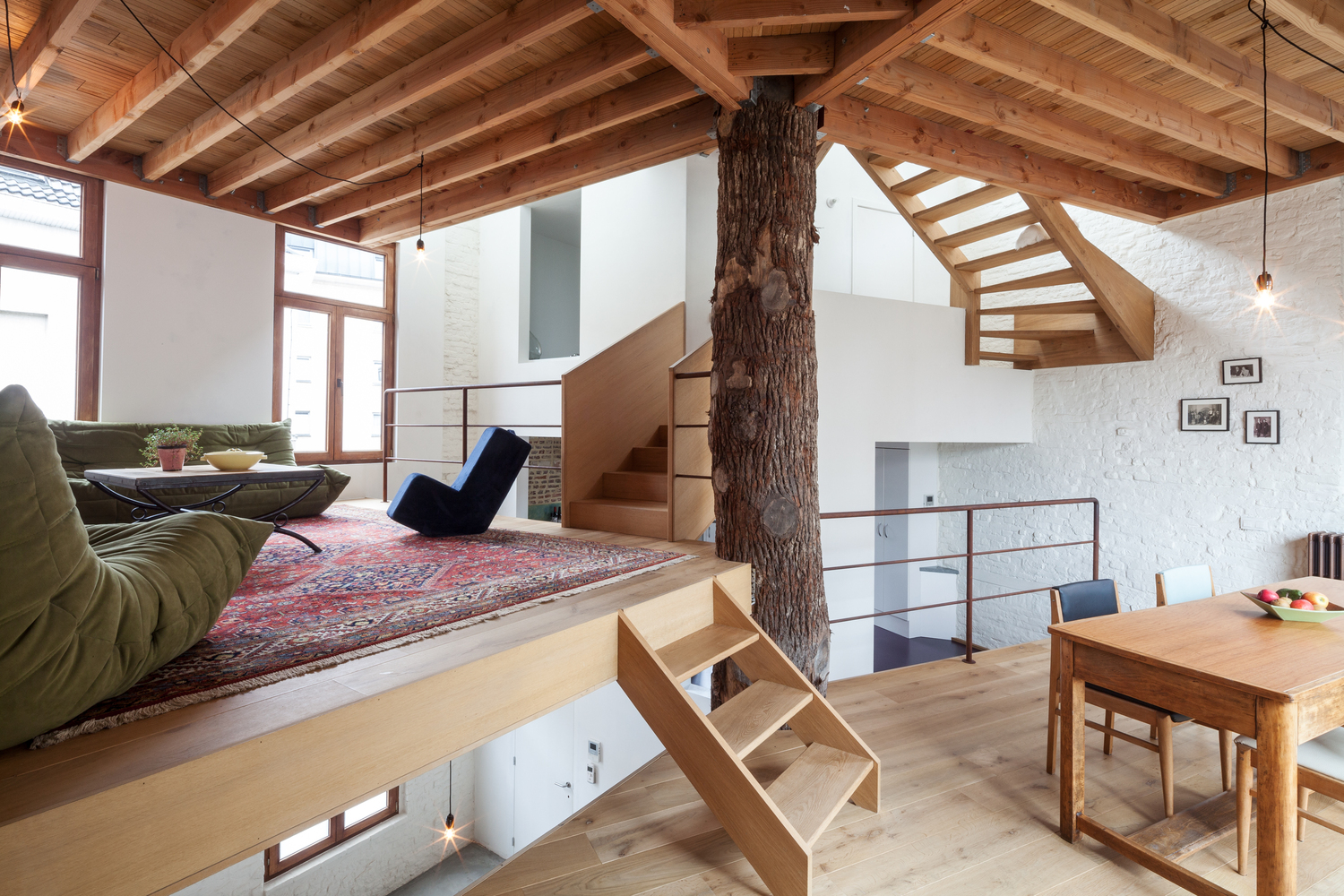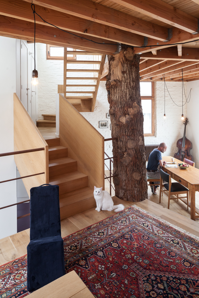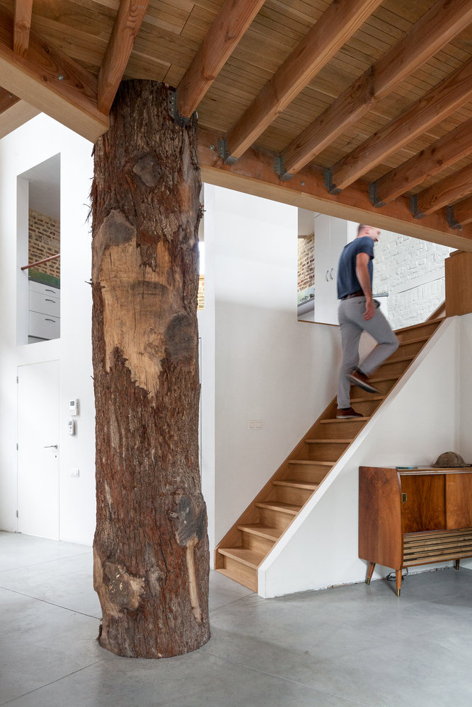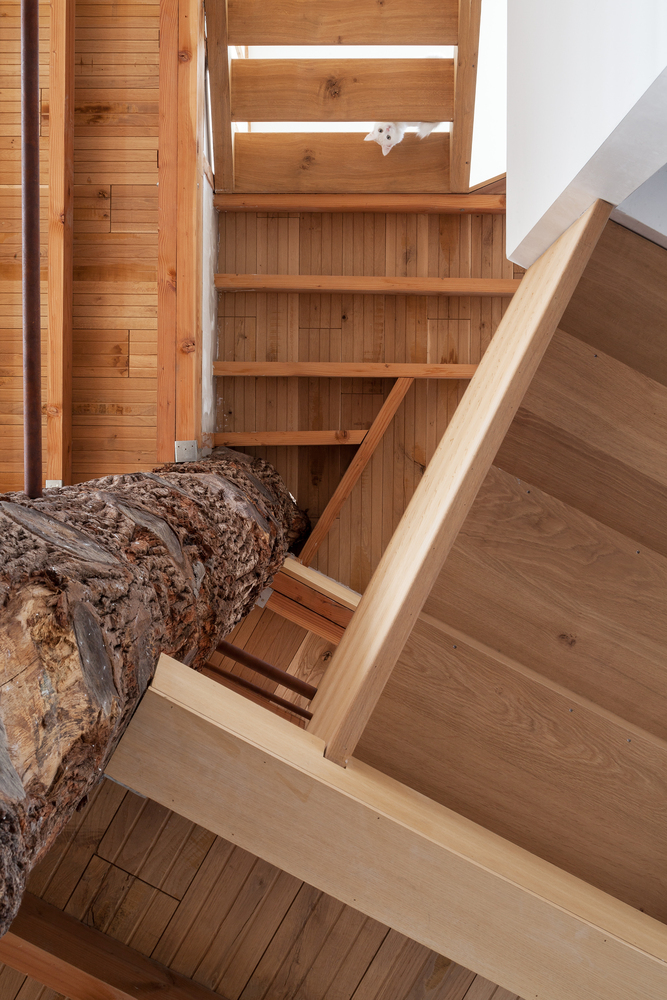 一段橡樹樹干被放置在五邊形平面正中間,作為新的支撐結(jié)構(gòu)。新的上層樓層懸掛在原有外墻和中心支柱之間,呈螺旋式上升。這樣就在生活區(qū)域內(nèi)創(chuàng)造出沒有任何內(nèi)墻的開放室內(nèi)空間。樹干中柱是一個合乎邏輯且經(jīng)濟實惠的解決方案,它立即為新居所帶來了合適的氛圍。衛(wèi)生間、廚房、入口和儲藏室/洗衣房都設(shè)置在縱貫上下的封閉體塊中。