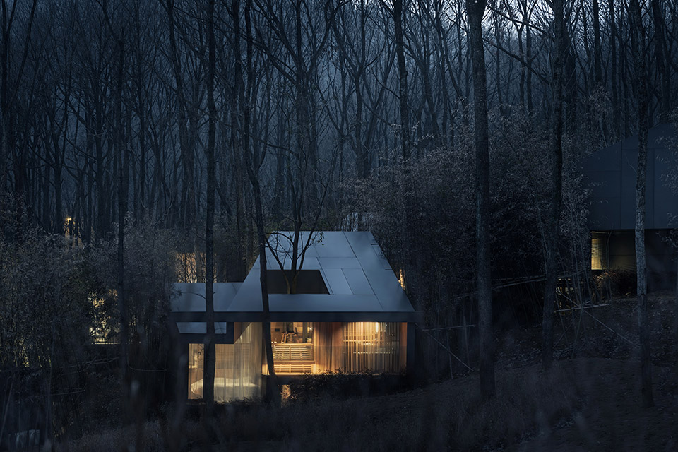 38-68m2的鋁殼小屋被安置于山林深處,向自然滲透。建筑的定義回歸到作為庇護(hù)所的基本概念之中,回到了建筑最基本的需求層面,作為可以遮風(fēng)擋雨的基本空間,為了滿足人的基本需求而存在。耐候的鋁制外殼可以經(jīng)受惡劣的自然氣候的侵蝕,堅(jiān)實(shí)的鋁制外殼與周圍的環(huán)境形成了鮮明的對(duì)比。