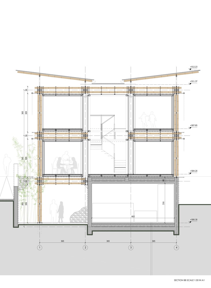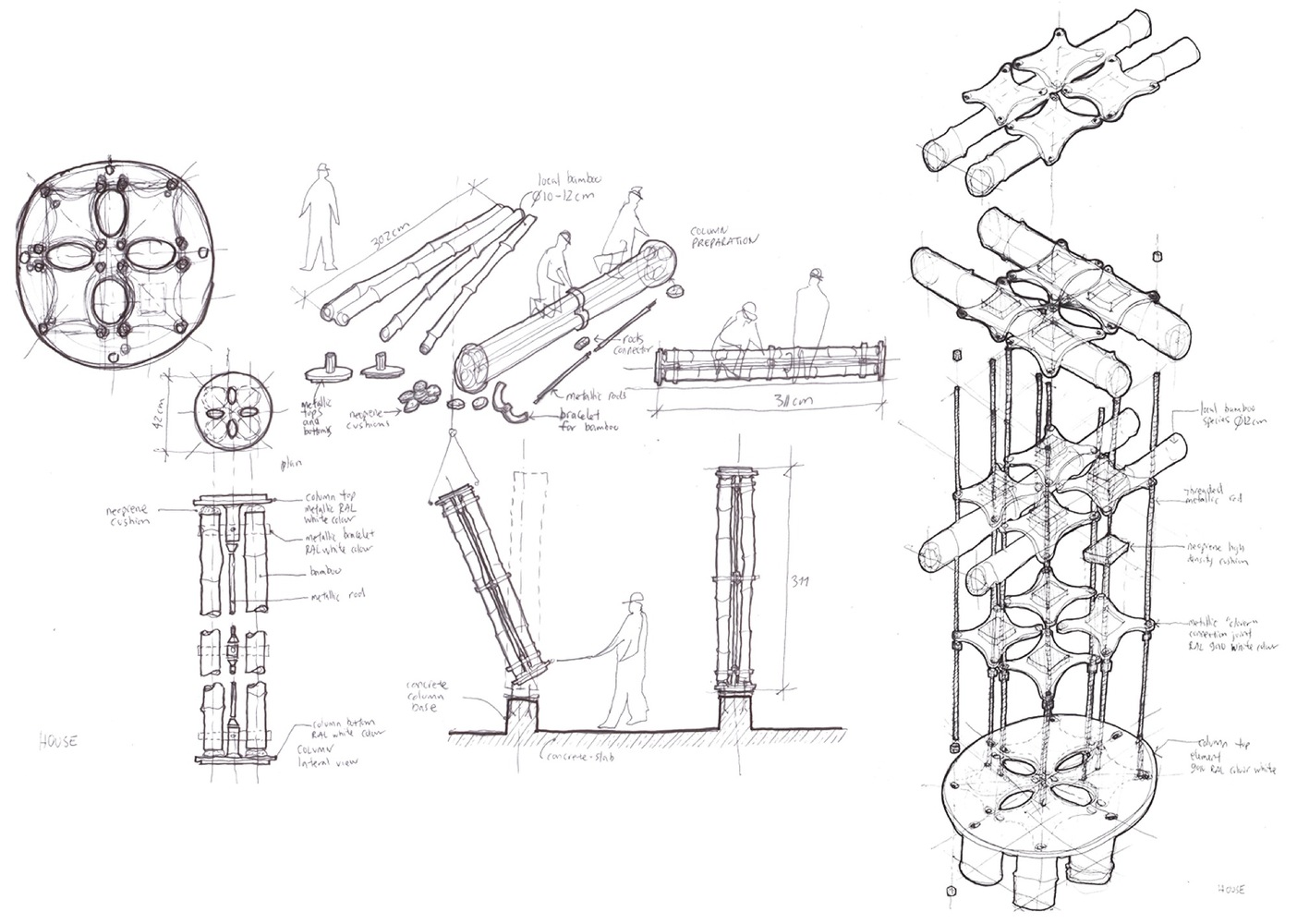 對于房子的結(jié)構(gòu),我們探索了以竹子為建筑材料的新方法。對我們而言,可持續(xù)發(fā)展不僅僅是使用竹子等天然材料,而是設(shè)計適當(dāng)?shù)氖┕し桨福?/span>