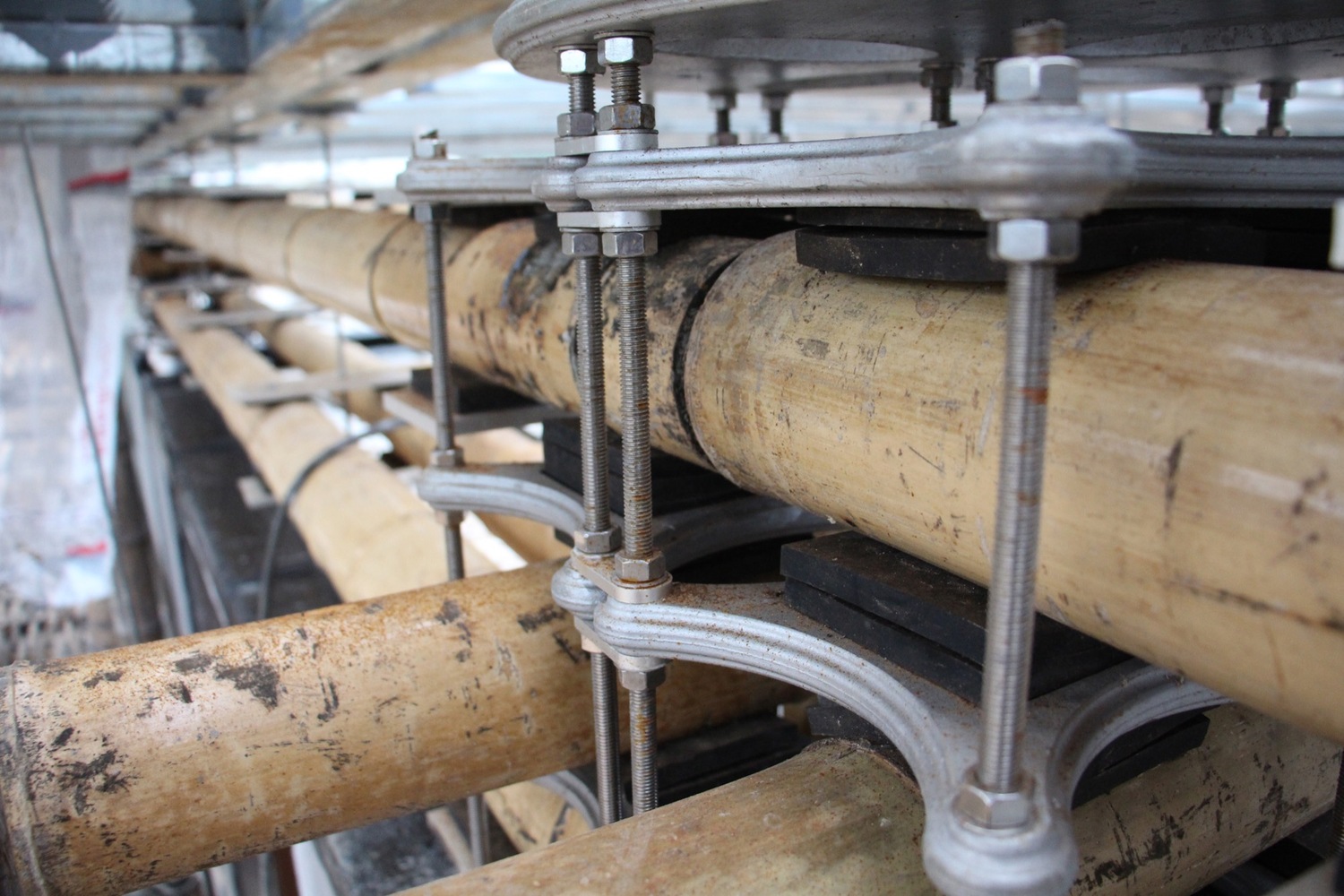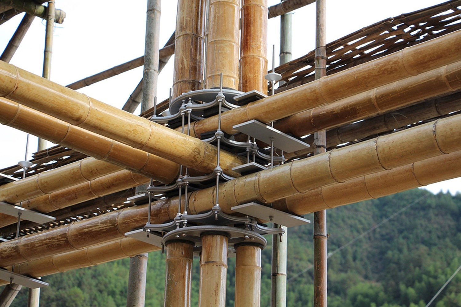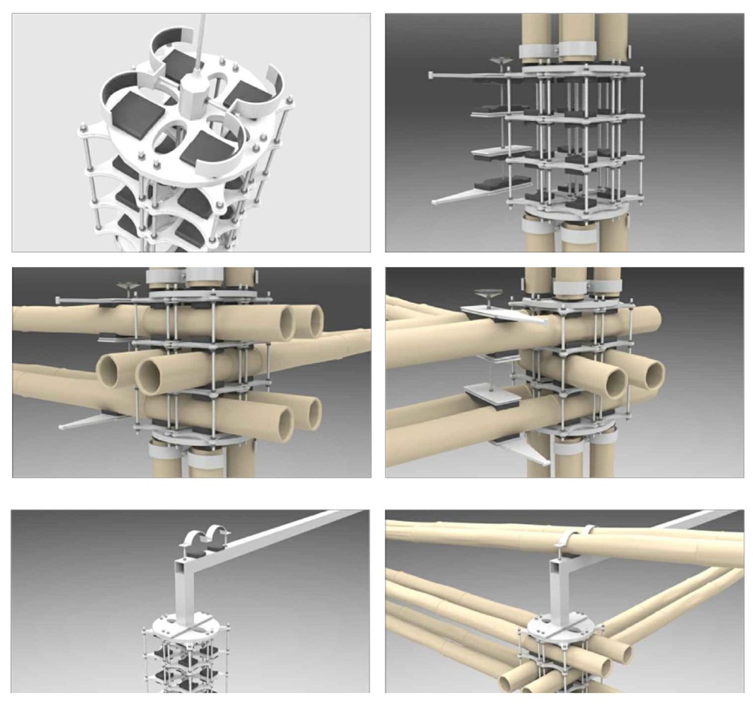 設(shè)計干式連接,不要通過穿孔削弱竹子,也不要用混凝土填充竹子,還可以根據(jù)需要更換竹桿;